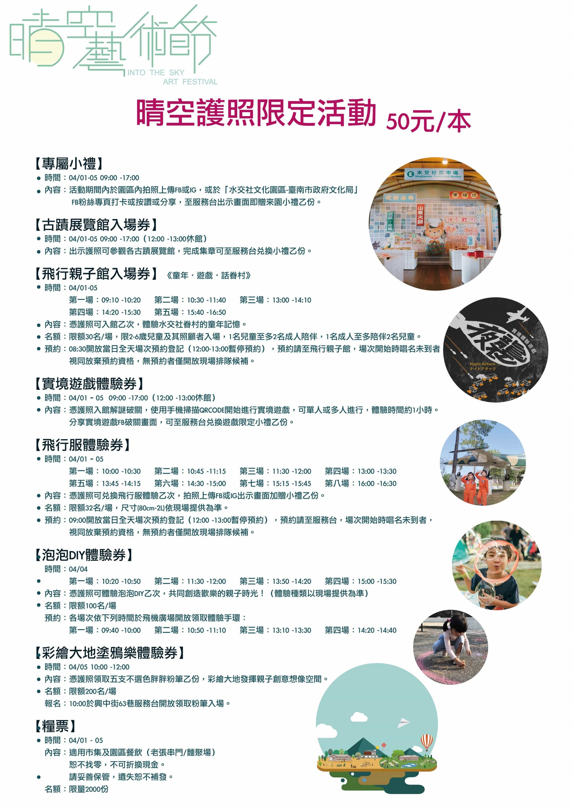 二、本計畫推出晴空護照活動,一本 50 元暢遊園區 5 日, 110 年 04 月 01 日上午 9 時於園區遊客中心開始販售,系列活動詳情請參考水交社文化園區官網及 FB 粉絲專頁。