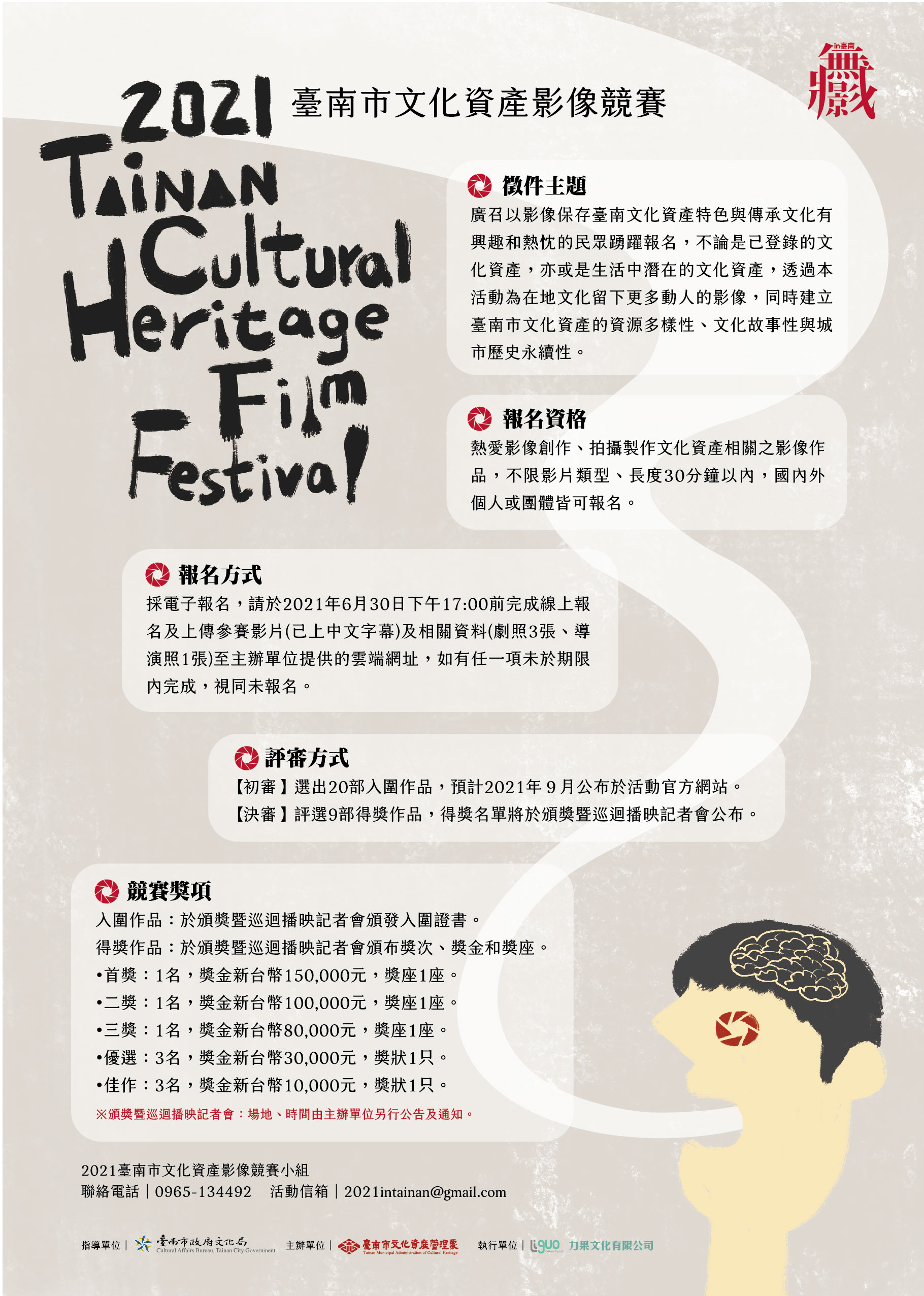 二、徵件期為即日起至 6 月 30 日下午 17 點止,以臺南市已登錄或生活中潛在的文化資產為創作元素與發想,不限影片類型、長度 30 分鐘以內,個人或團體國內外人士皆可報名。總獎金 45 萬元。詳情請上官網查詢 https://2021intainan.com/ 。