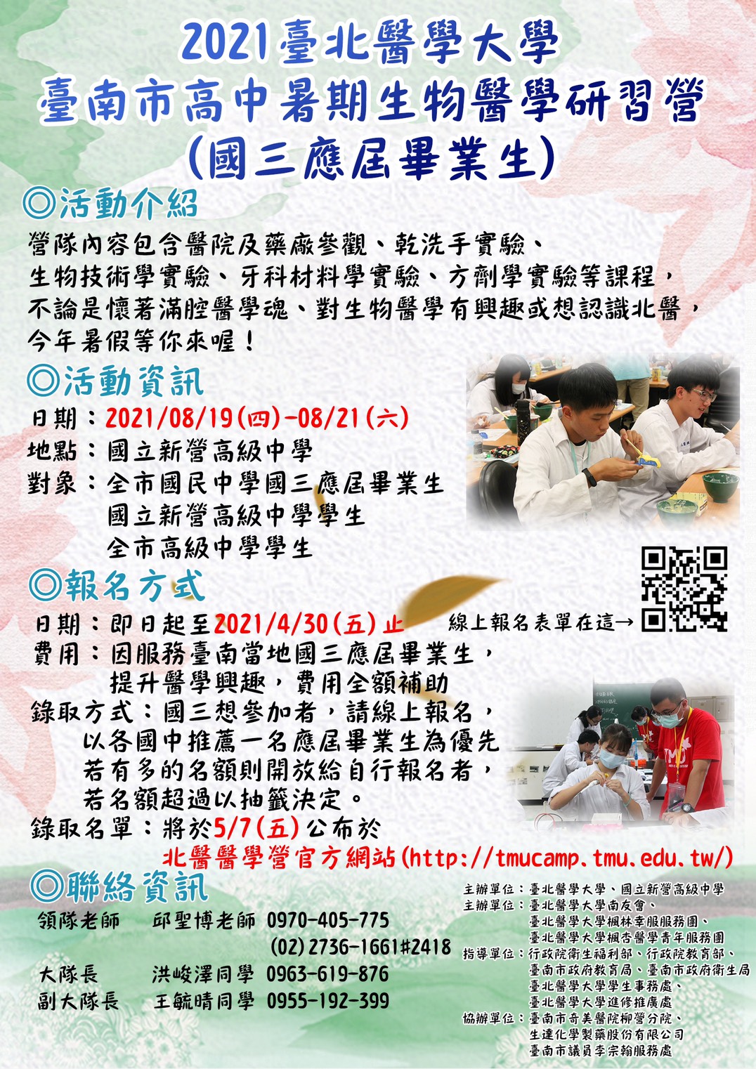 二、該校南友會擬訂於 110 年 8 月 19 日(星期四)至 8 月 21 日(星期六)假國立新營高級中學辦理臺南市高中暑期生物醫學研習營。