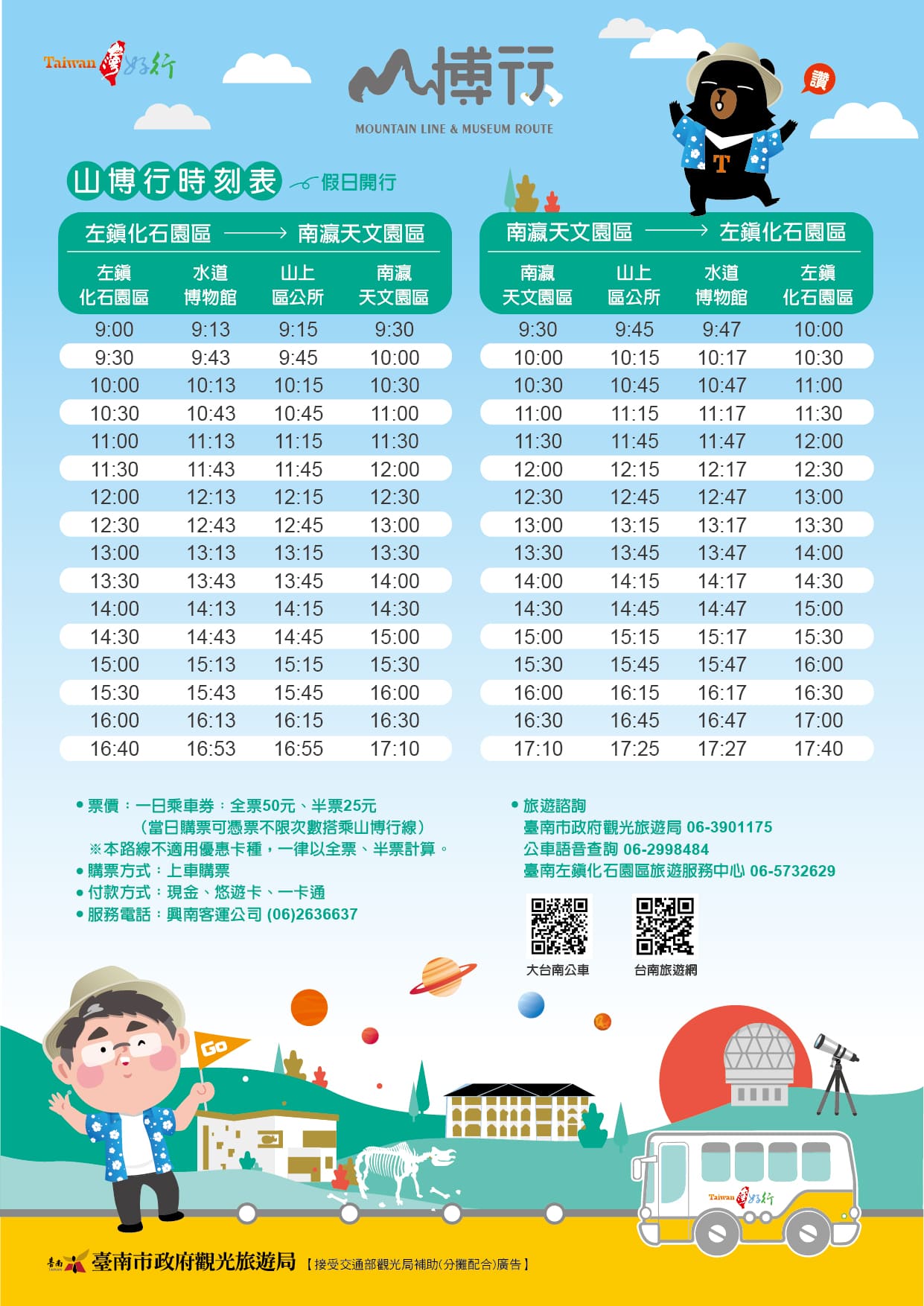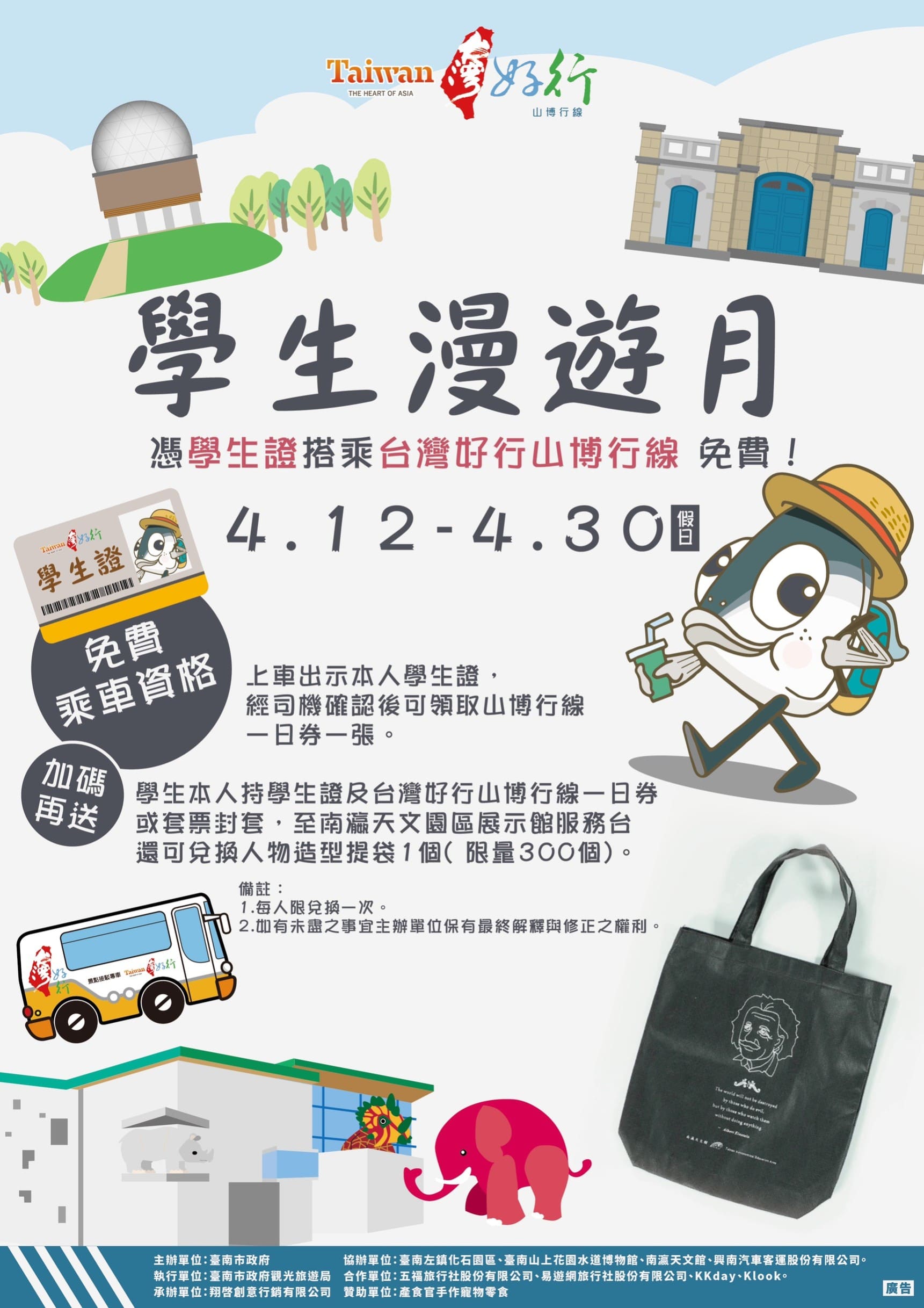 一、為配合 4 月 22 日世界地球日,並推廣本市低碳旅遊,本市台灣好行山博行線觀光公車於 110 年 4 月 12-30 日(假日)辦理「學生漫遊月」主題活動,活動期間憑學生證上車即可獲得山博行線一日乘車券,當日不限次數免費搭乘,並可享有當日不限次數免費轉乘綠幹線與橘幹線、憑學生證及車票至南瀛天文園區展示館服務台免費兌換人物造型提袋 1 個(限量 300 個,送完為止)。