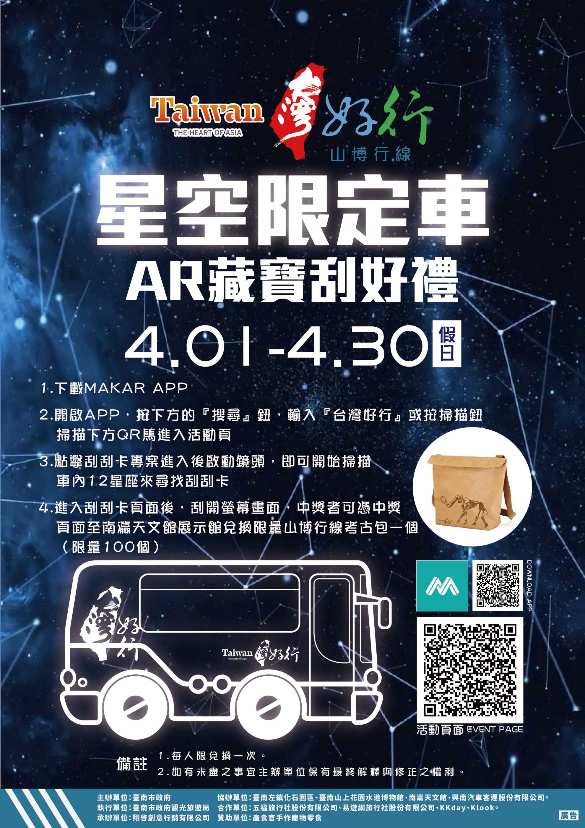 二、另於 110 年 4 月 1-30 日(假日)搭乘台灣好行山博行線星空限定車(無障礙班次),下載活動指定 APP 掃描車內特定星座圖卡,即可獲得 AR 刮刮卡,中獎者可至南瀛天文園區展示館服務台免費兌換台灣好行山博行線考古包 1 個(市價 499 元,限量 100 個,送完為止)。