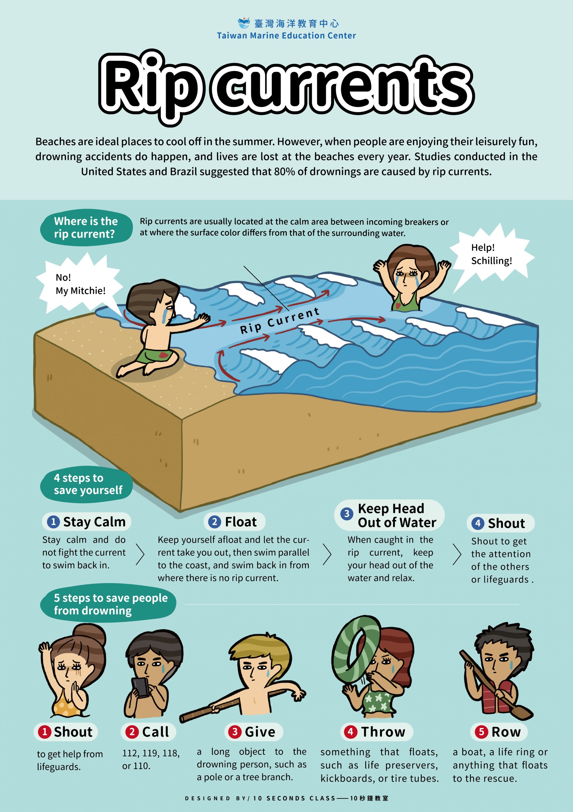 2.隨流移動-不抵抗水流,平行海岸游出影響區,之後再往岸上移動。