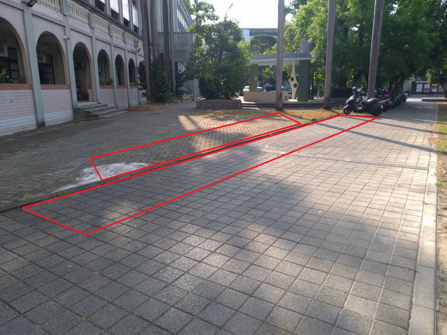 機車停放請至前庭福安坑溪與花圃間的通道,如下圖紅框處。