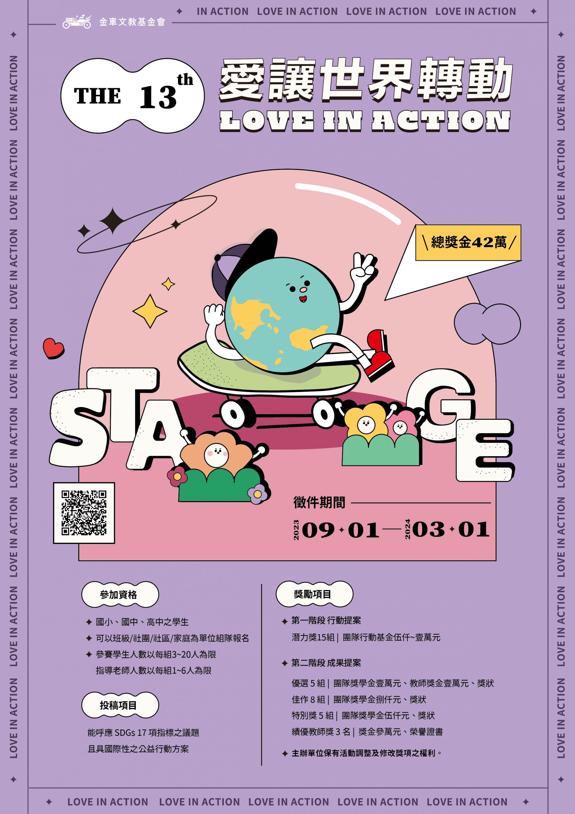 一、本會自 2011 年開始舉辦「愛讓世界轉動 兒少公益行動」徵選,以 STAGE 行動步驟為基礎,從發現問題、創意思考、行動實踐到收穫反思,鼓勵青年學子以國際視野落實在地行動,培育下個世代成為具備同理心、行動力及團隊溝通力之世界公民。