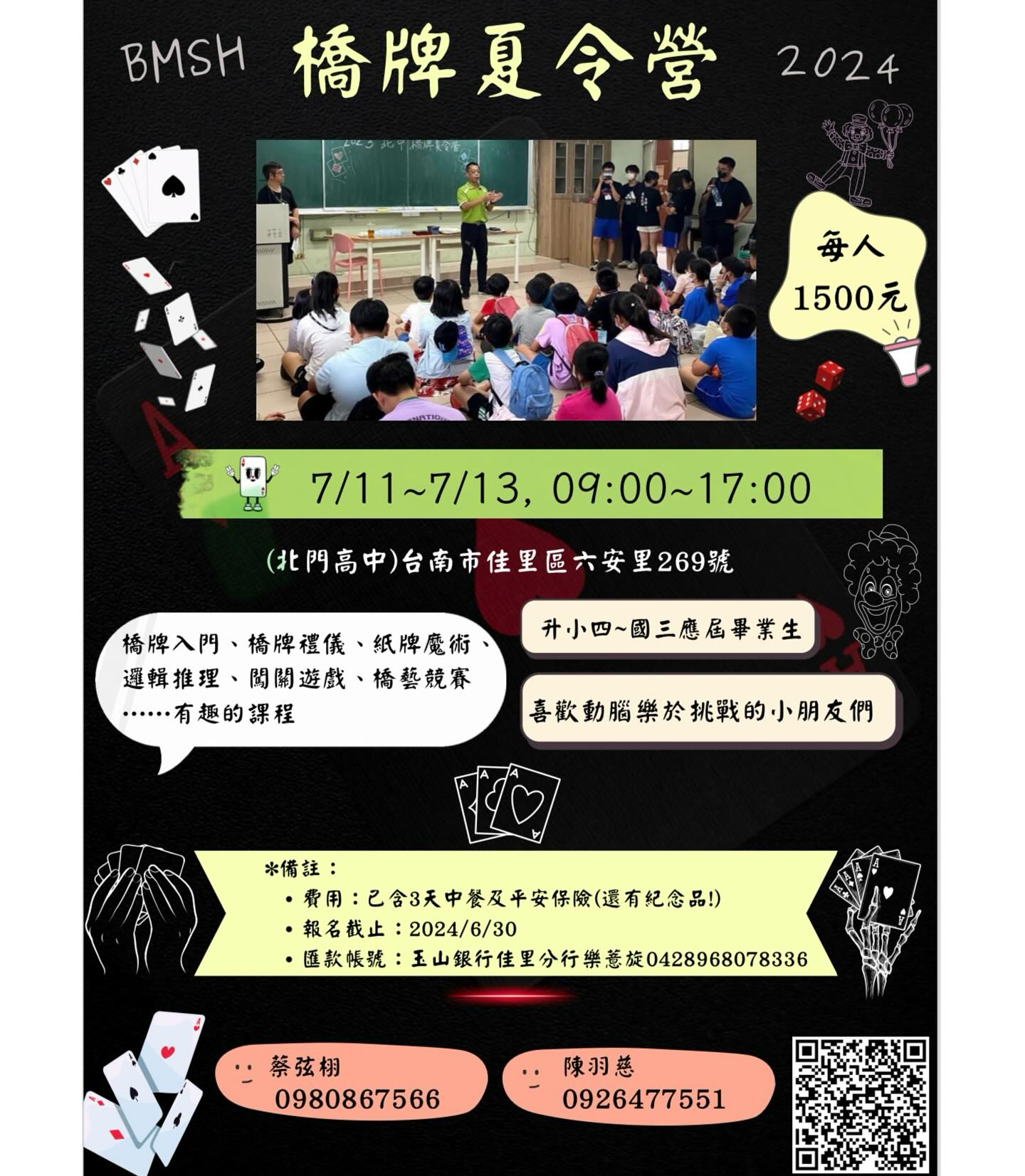 一、 為促進橋牌活動之風氣,並培養孩子學習動腦、勇於挑戰的精神,本校特舉辦此次夏令營,邀請即將升國小四年級至國中畢業生參與。 二、 夏令營日期: 113 年 7 月 11 日(四)至 13 日(六), 9:00 至:17:00 。 三、 夏令營地點:國立北門高級中學(台南市佳里區六安里 269 號)。 四、 參加費用: 1500 元(含中餐、保險、紀念品)。 五、 報名表單: https://reurl.cc/gGjzgp 六、 詳細資料請參考活動宣傳海報,如附件。