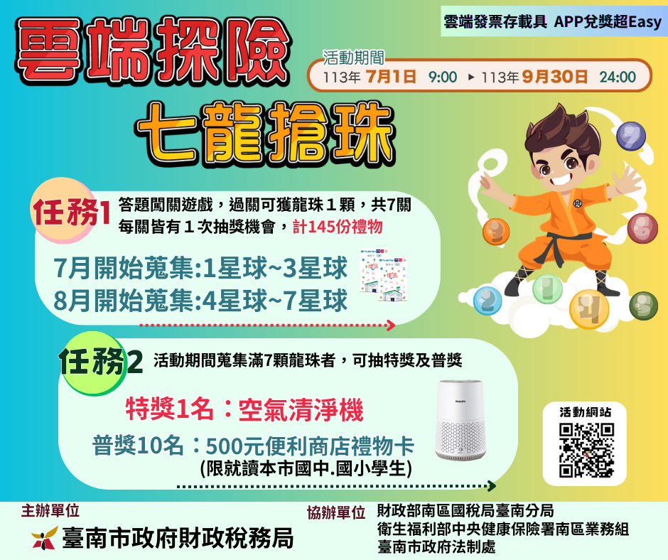2. 於活動期間內蒐集滿 7 顆龍珠者,抽出特獎 1 名,可獲得 空氣清淨機 1 臺;另專屬本市國中、小學生抽出普獎 10 名,每名可獲得 500 元超商禮物卡,詳情請至活動網站 (https://pse.is/64bfbg 。