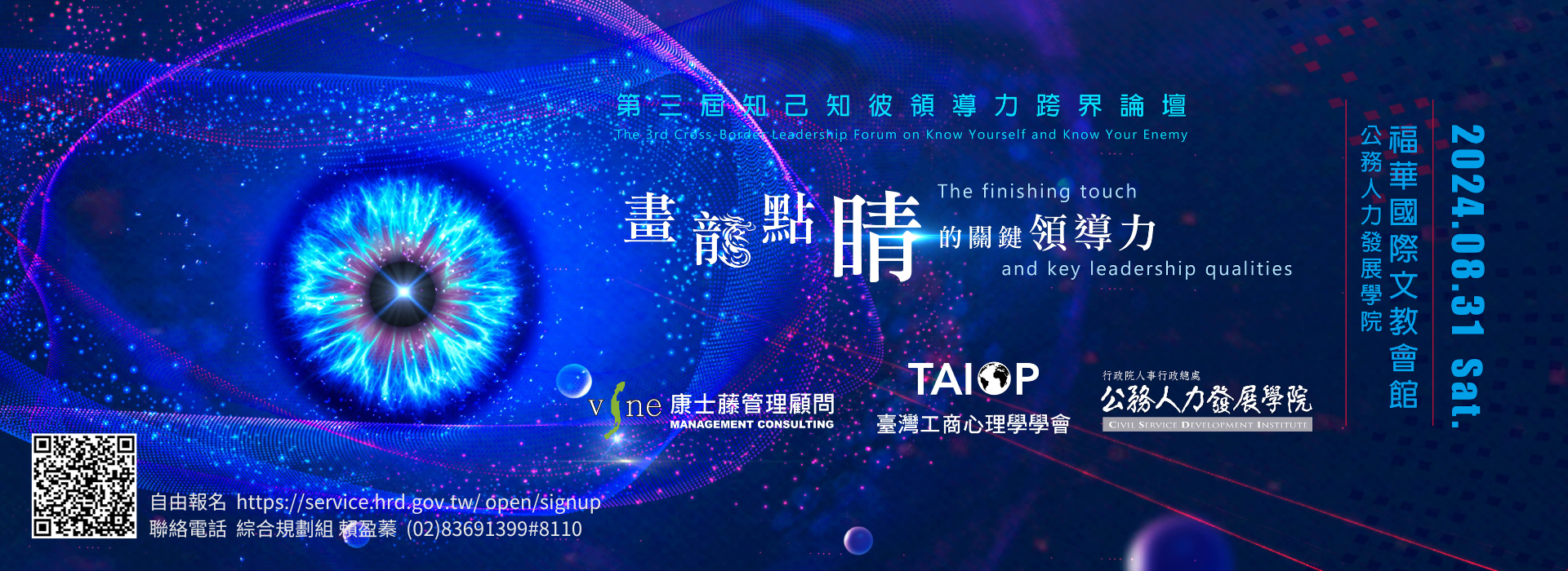 檢送行政院人事行政總處公務人力發展學院與康士藤管理顧問公司及臺灣工商心理學學會( TAIOP )共同主辦「2024 第三屆知己知彼領導力跨界論壇─畫龍點睛的關鍵領導力」之實施計畫及宣傳橫幅各 1 份,請同仁踴躍參與。