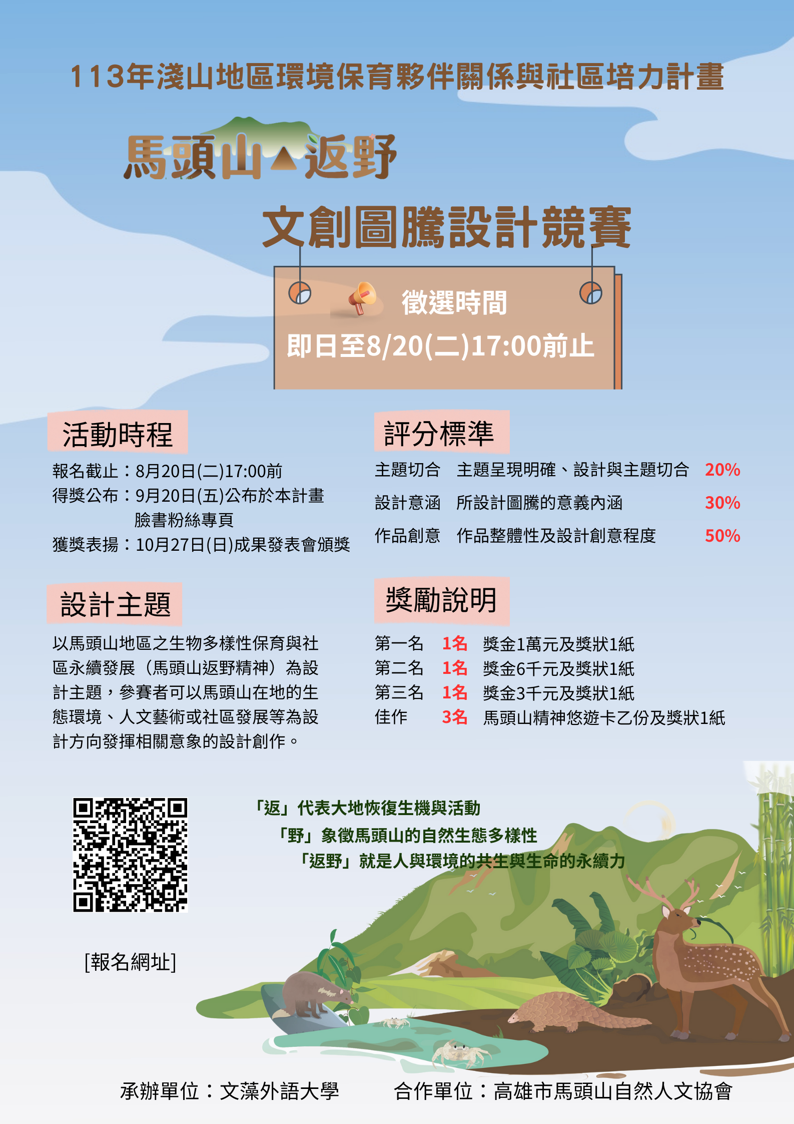 轉知文藻外語大學「113 年度淺山地區環境保育夥伴關係與社區培力計畫」馬頭山返野文創圖騰設計競賽,檢送徵選簡章、宣傳文件及活動海報電子檔各 1 份。