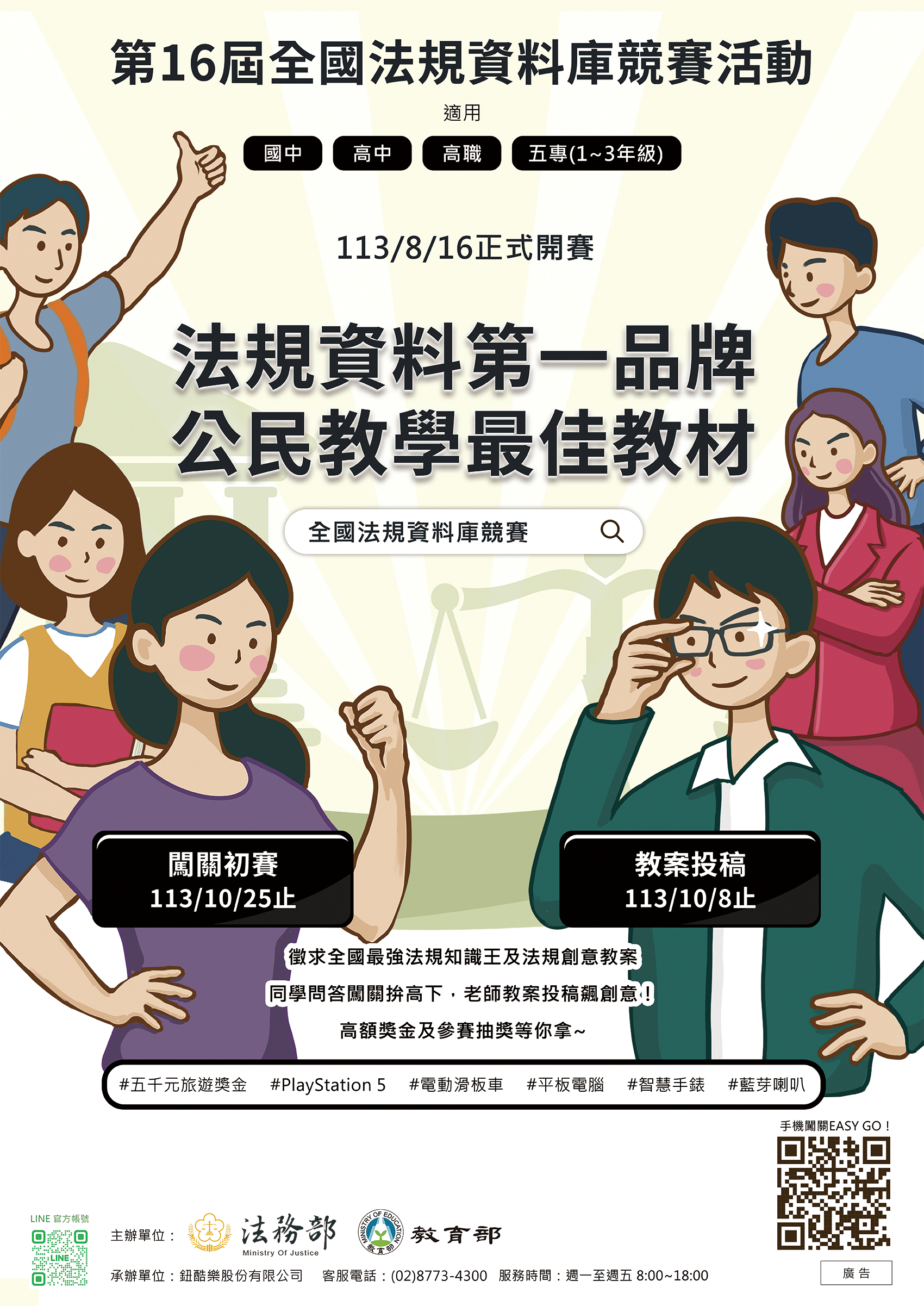 二、全國法規資料庫競賽活動,係法務部與教育部自 97 年起共同 舉辦之競賽活動,目的為宣導全國國中、高中職(含五年 制專科學校一、二、三年級)學生善用「全國法規資料 庫」,建立知法守法的觀念,以及期許全國國中及高中職 (含五年制專科學校)教師發揮創意將「全國法規資料 庫」資源融入教學之競賽活動,本屆 2 式競賽活動內容如 下