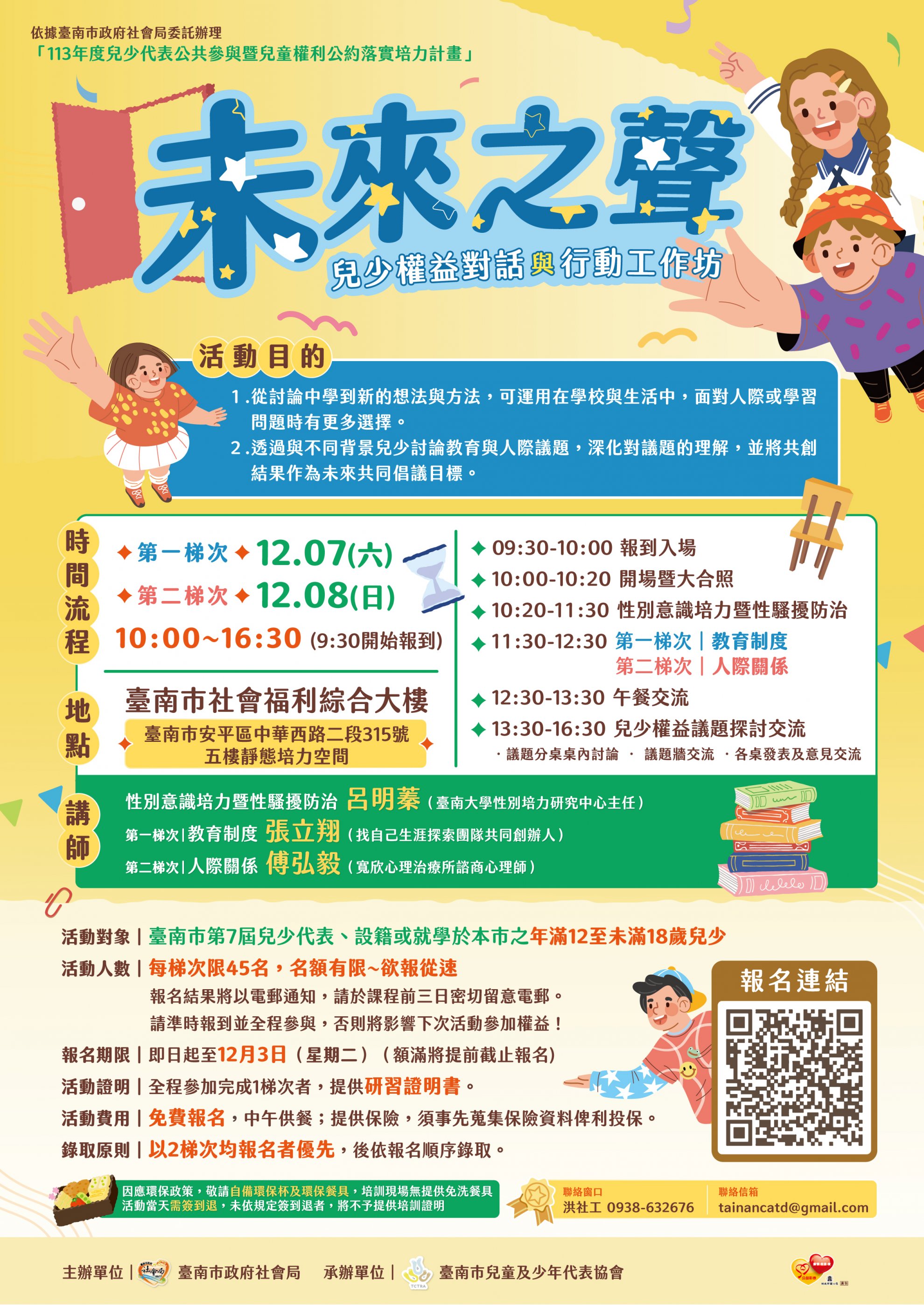 臺南市社會局辦理大型兒少權益活動─「未來之聲:兒少權益對話與行動工作坊」,歡迎有興趣的同學報名參加!