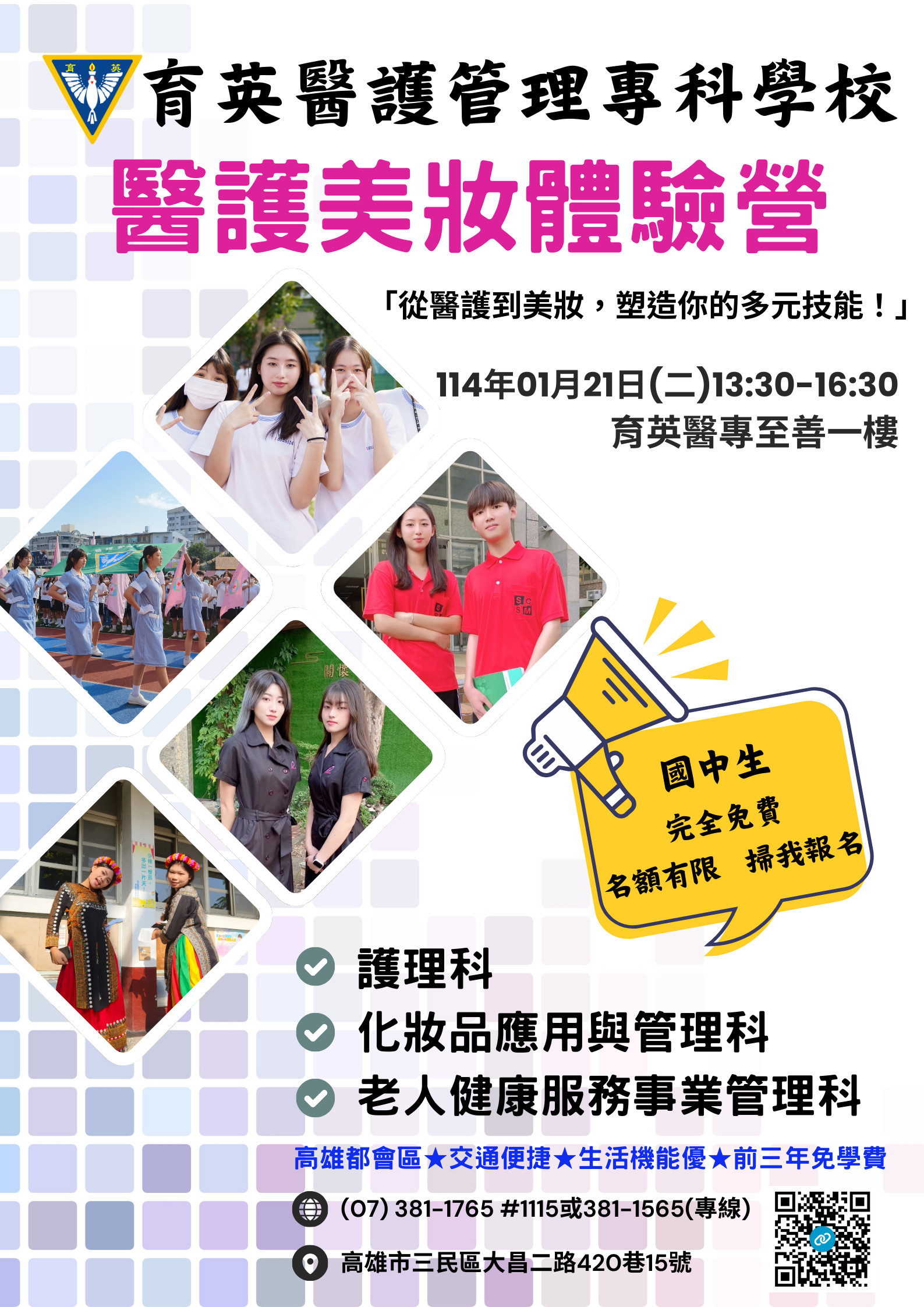 四、體驗科系:護理科、老人健康服務事業管理科、化妝品應用與管理科。↵