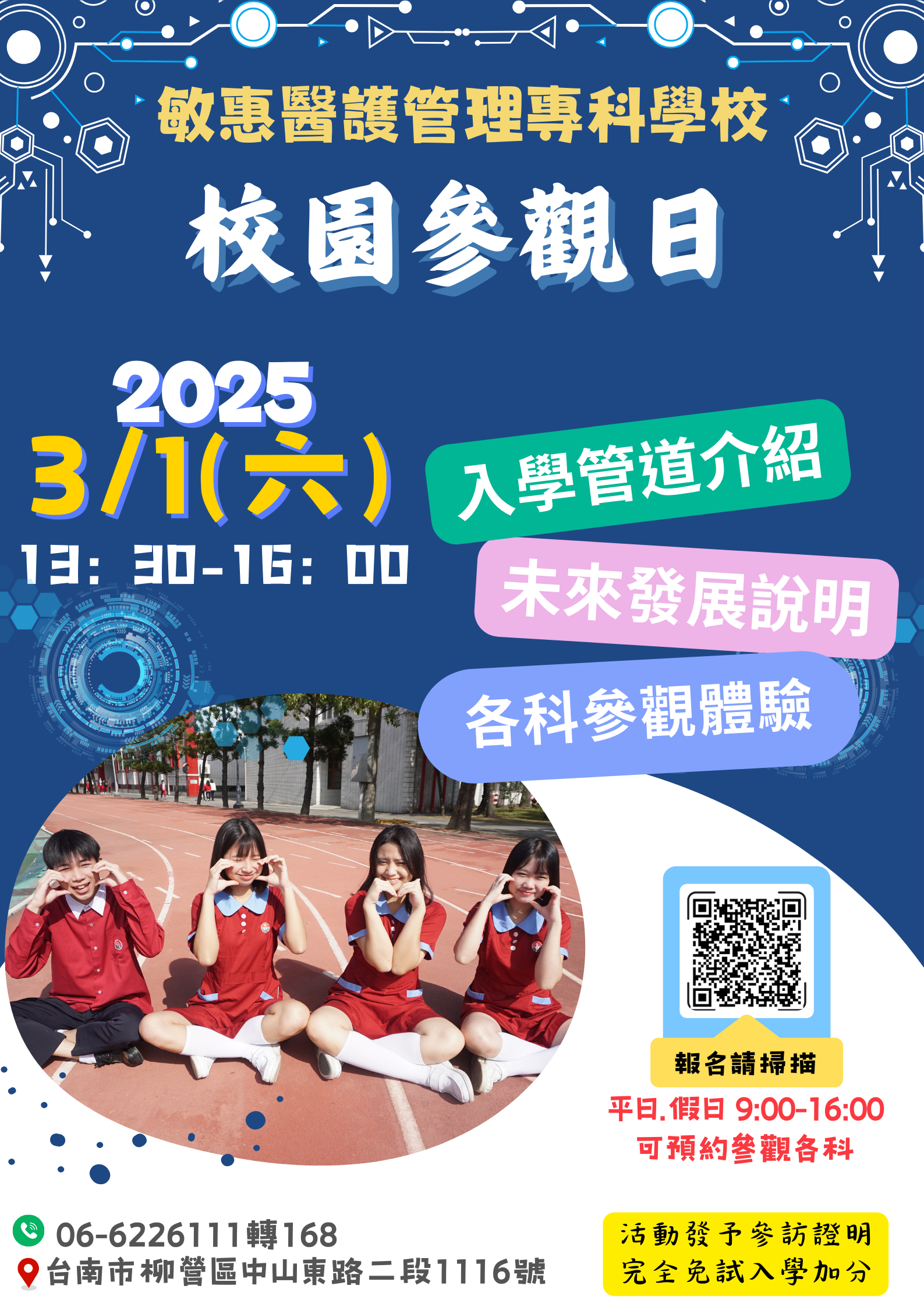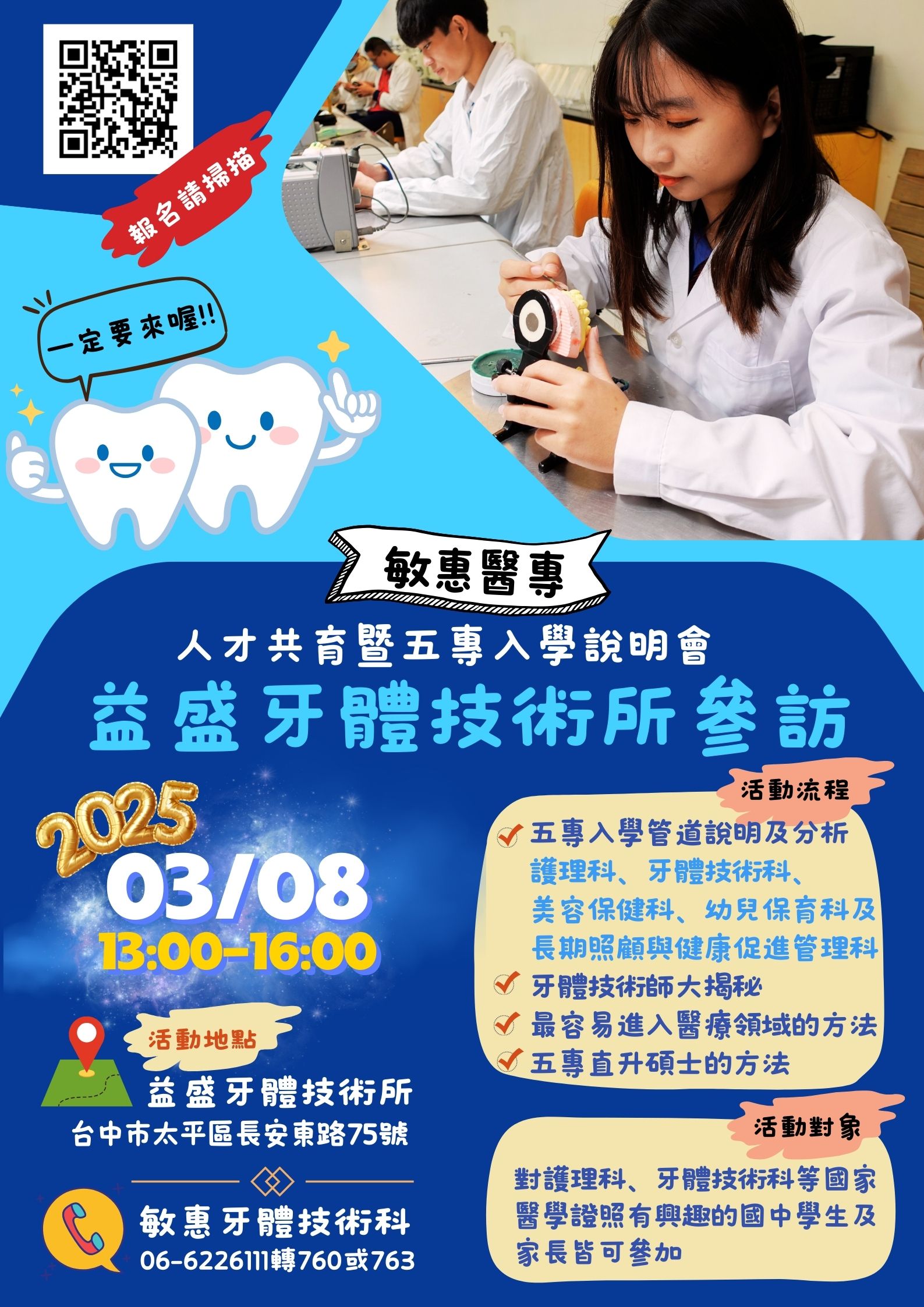 說明: 一、為使對醫護類科有興趣之國中生及家長了解入學管道及未來發展,本校舉辦以下活動: (一)校園參觀暨五專入學管道說明會 1、時間: 114 年 3 月 1 日(六)13 : 30 至 16:00 2、地點:敏惠醫護管理專科學校 3、報名網址: https://reurl.cc/p9pkbZ (二)人才共育暨五專入學管道說明會 1、時間: 114 年 3 月 8 日(六)13 : 30-16 : 00 2、地點:益盛牙體技術所(台中市太平區長安東路 75 號) 3、報名網址: https://reurl.cc/DKxVVd 二、活動海報,詳見附件。