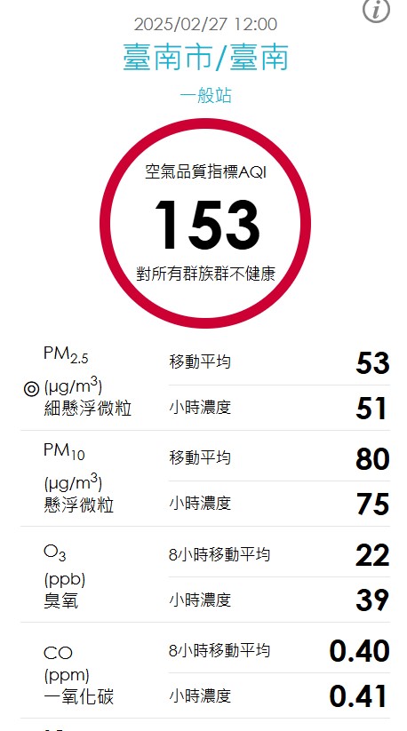 一、目前空氣品質不良,空氣品質指標指數顯示對所有群族群不健康,請避免長時間劇烈運動。