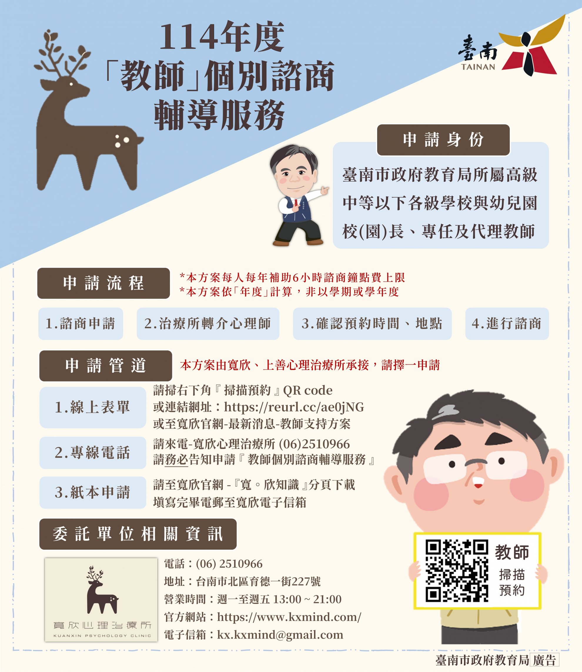 為促進及維護教師、教保服務人員心理健康及相關政策推動,本局業於 114 年 3 月 13 日與諮商輔導受託單位(寬欣心理治療所及上善心理治療所)簽約(後續如有其他受託單位將另行通知),相關諮商服務事項詳如說明