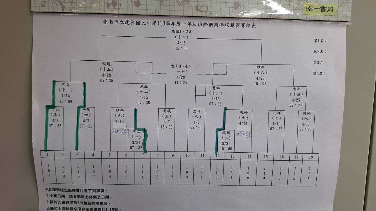 通知 一 , 113 學年度班際樂樂棒比賽 4/7 賽程公告,如附檔所列 二, 4/7 第七節課,比賽班級 105;117(全班學生公假登記)