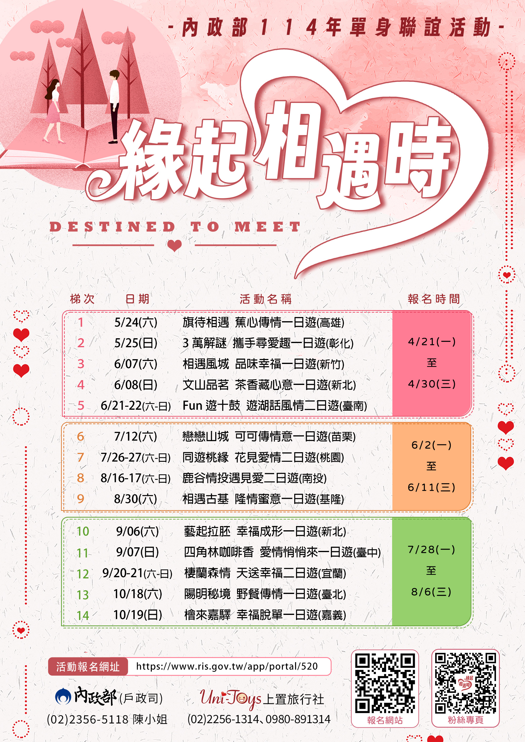 內政部 114 年「緣起相遇時」單身聯誼活動,第 1-5 梯次訂於 114 年 4 月 21 至 30 日受理報名,請單身男女踴躍參加