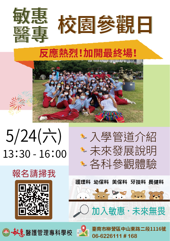 說明: 一、為使學生、家長了解入學管道及未來發展,本校舉辦校園參觀暨入學說明會。 二、活動時間:114 年 5 月 24 日(六)13:30 至 16:00 三、活動對象:對醫護類科有興趣之國中生及家長 四、報名網址:https://forms.gle/X2GhCHsrzfHFZ2vW8 五、活動海報,詳見附件