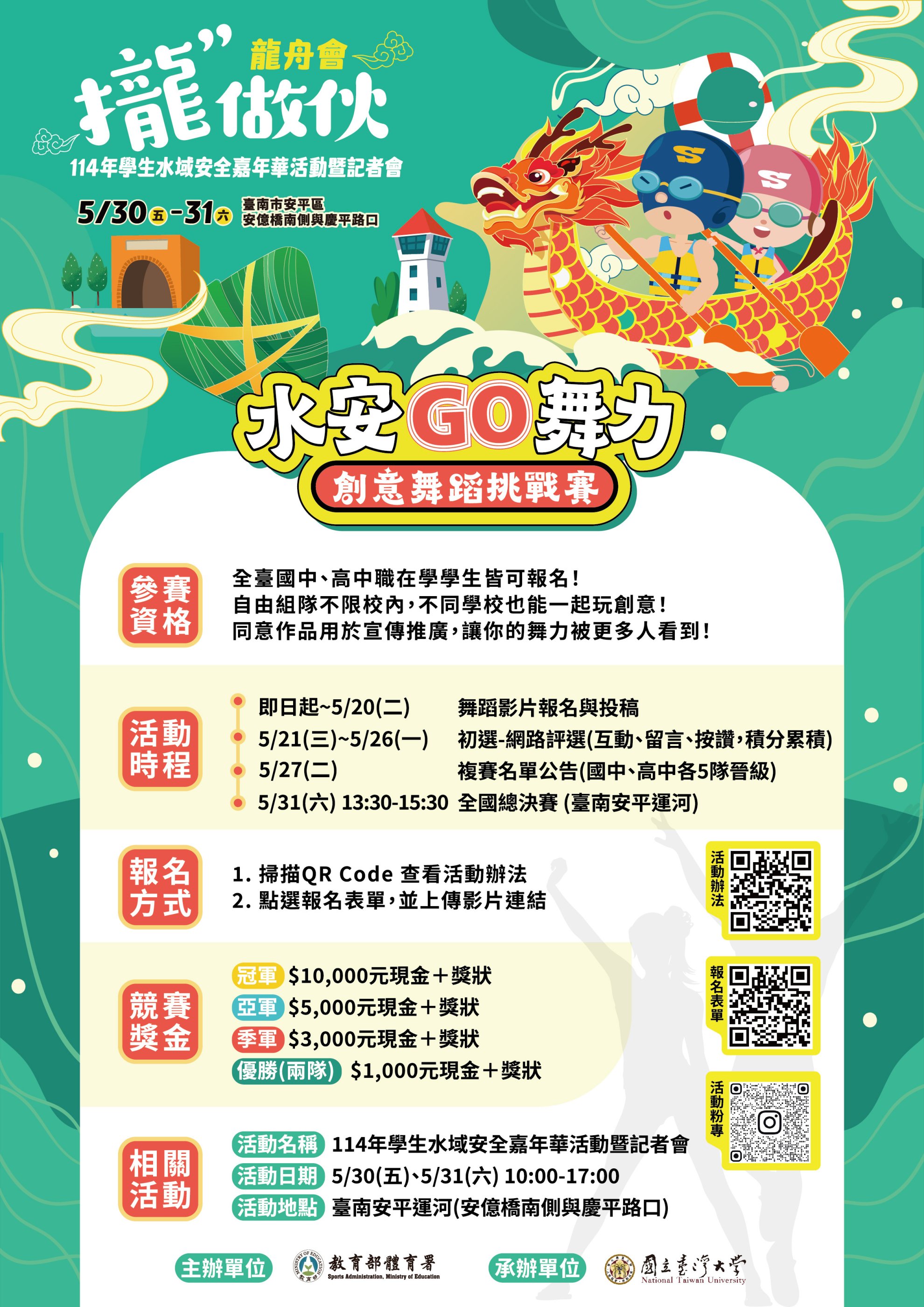二、為提升青少年學生水域活安全知能與自救能力,由教育部體育署委託該校辦理旨揭活動,透過創意舞蹈挑戰賽、免費水域活動體驗、及闖關解謎互動參與,將正確水域安全觀念向下扎根。