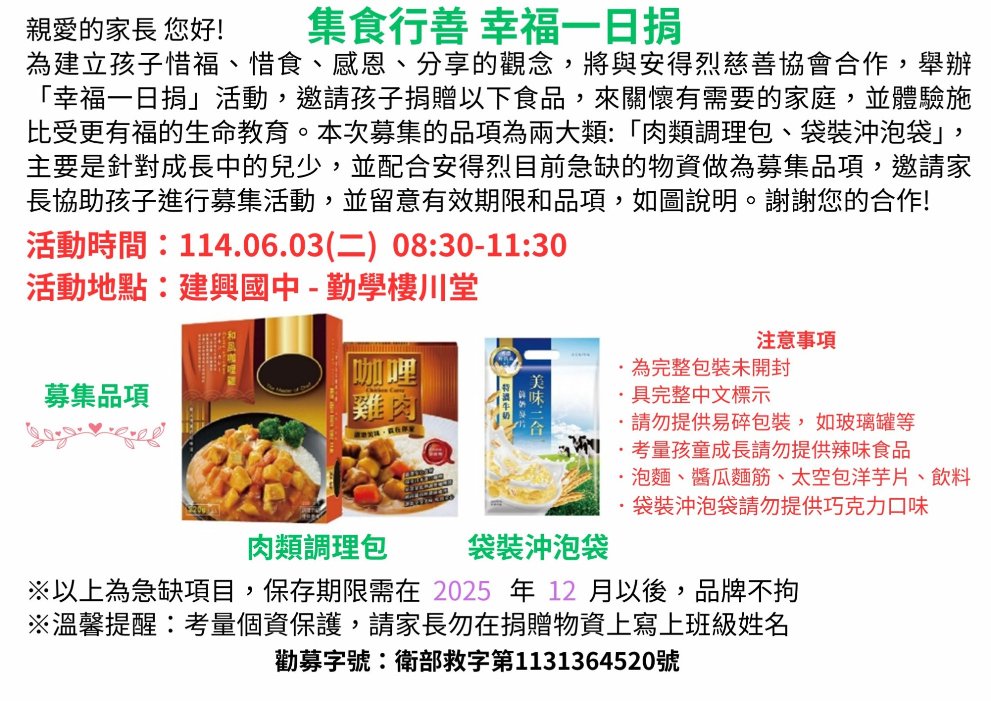 安德烈慈善協會與本校合作辦理「集食行善 幸福一日捐活動」