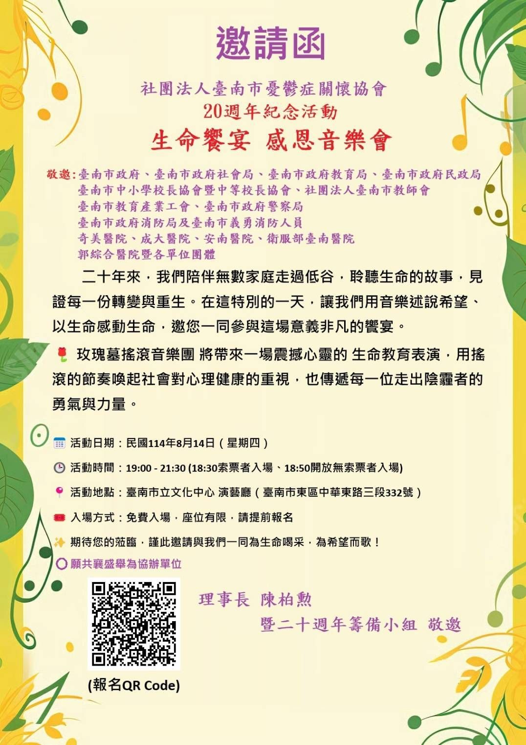 一、依據財團法人臺南市憂鬱症關懷協會(下稱憂協) 20 週年紀念活動─生命饗宴 感恩音樂會邀請函。