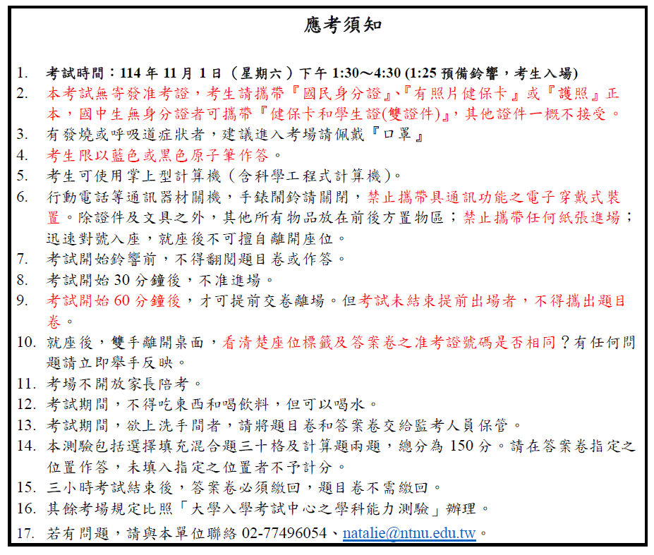 (1) 考生通知單已於 114 年 10 月 20 日寄至考生 Email 信箱。
