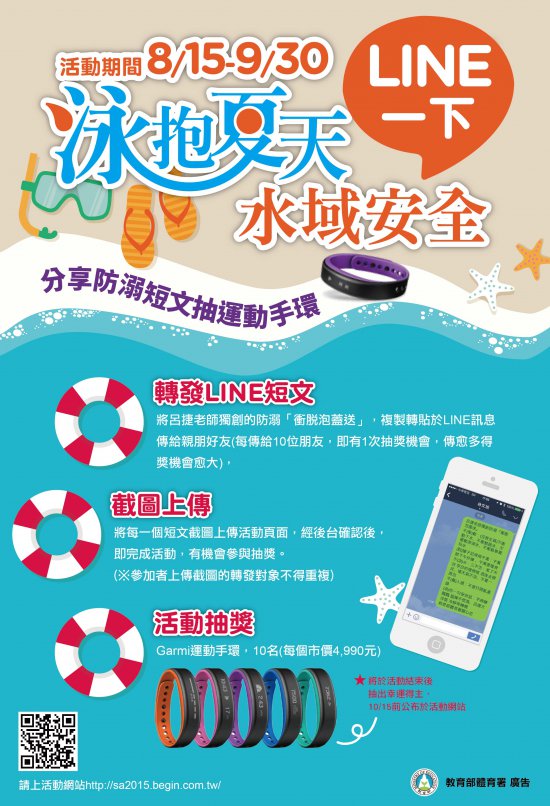 一、旨揭活動自 104 年 8 月 15 日起至 9 月 30 日止,歡迎學校師生及家長踴躍參加,將防溺「衝脫泡蓋送」口訣,複製轉貼於 line 訊息給親朋好友,並截圖上傳至網址:http://sa2015.begin.com.tw/ ,即有機會獲得大獎。
