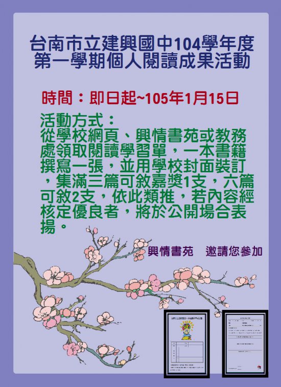 從學校網頁、興情書苑或教務處領取閱讀學習單,一本書籍撰寫一張,並用學校封面裝訂,集滿三篇可敘嘉獎 1 支,六篇可敘 2 支,依此類推,若內容經核定優良者,將於公開場合表揚。