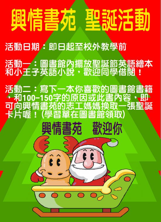 活動二:寫下一本你喜歡的圖書館書籍,和 100-150 字的原因或此書內容,即可向興情書苑的志工媽媽換取一張聖誕卡片喔!(學習單在圖書館領取)
