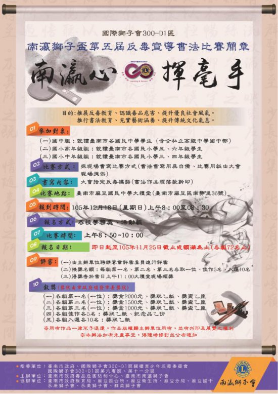 六、檢附 105 年「南瀛獅子盃第五屆反毒宣導書法比賽」計畫書乙份、獅子會書法簡章、獅子會書法報名表。