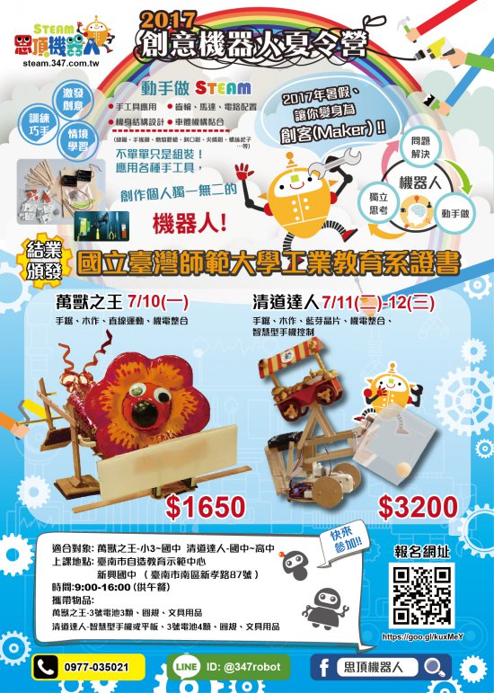 二、本活動鼓勵學生手鋸、木作、機電整合、藍芽晶片、智慧型手機控制等,讓學生創作個人獨一無二的機器人,變身為創客( Maker )。