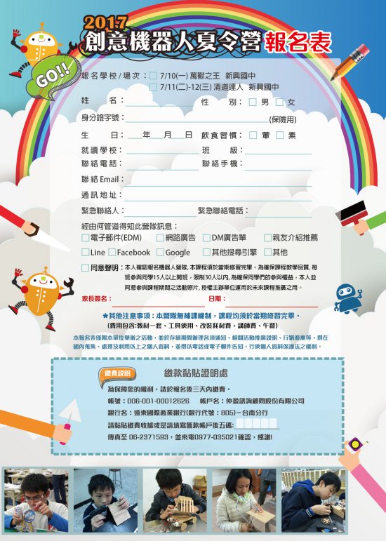 主旨:檢附新興國中與仲盈顧問公司合辦之「2017 創意機器人夏令營」活動文宣品 1 份,敬請惠允公告及鼓勵貴校學生踴躍參加。