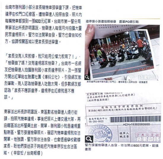 報載(網址:http://www.appledaily.com.tw/realtimenews/article/new/20171012/1221196/;如附件)屢有民眾逕向警察單位以相片檢舉家長於接送孩子上放學時,違規停車,遭警察單位開罰單情事。