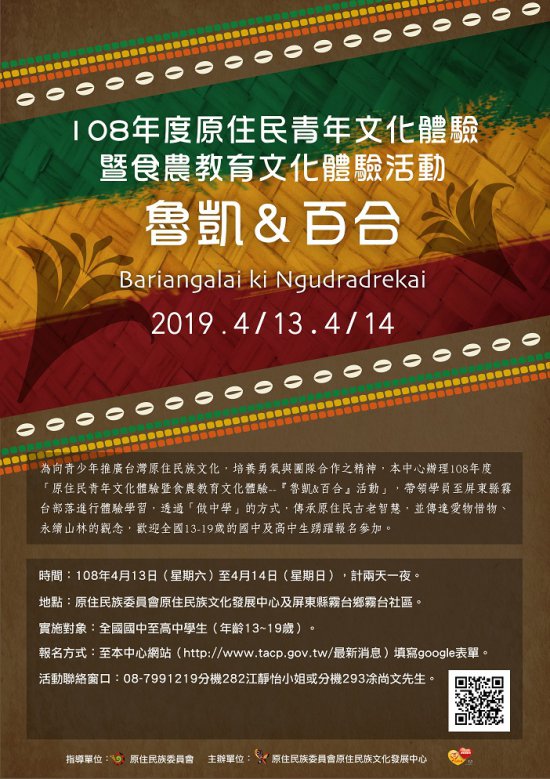 一、該活動係向青少年推廣臺灣原住民族文化,培養勇氣與團隊合作之精神,帶領學員至屏東縣霧台部落進行體驗學