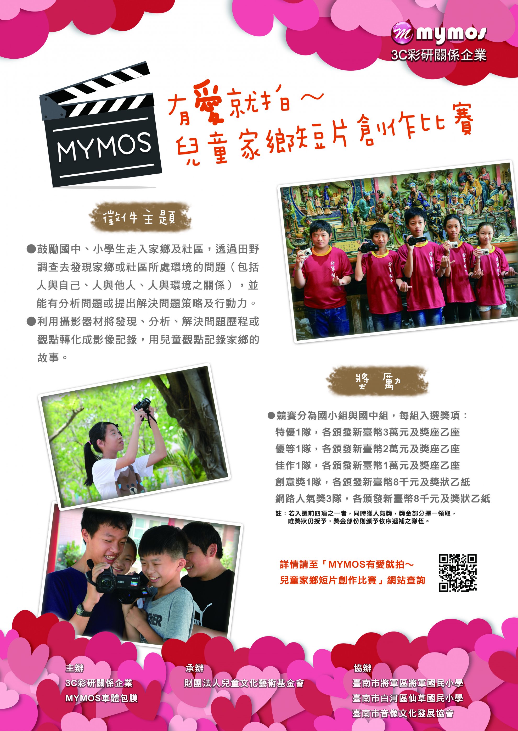 一、由 MYMOS 企業集團贊助本會辦理「MYMOS 有愛就拍〜兒童家鄉短片創作比賽」活動辦法說明如下: 1.MYMOS 企業集團長期致力於社會公益服務,期盼藉由辦理本次活動,鼓勵國中、小學生走入家鄉及社區,透過田野調查去觀察及發現家鄉或社區所處環境的問題(包括人與自己、人與他人、人與環境之關係),並能有分析問題或提出解決問題策略及行動力。利用攝影器材將觀點及歷程轉化成影像記錄,用兒童觀點說家鄉的故事,藉由本活動鼓勵優秀小導演及創作團隊持續發現社會中良善的力量,並為社會公益盡一己之力。 2.參與對象:國中、小在籍之學生。 3.活動網址及簡章下載請至 https://mymoslove.weebly.com/