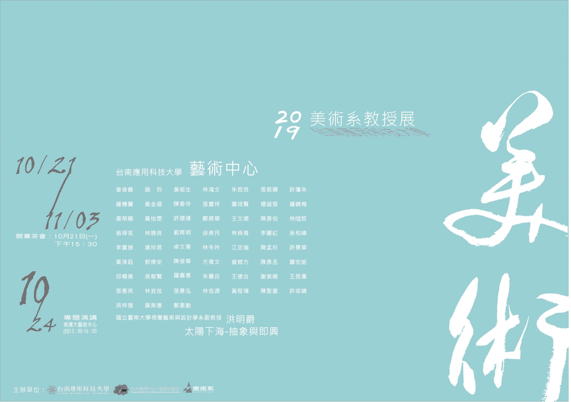 說明: 一、旨揭該活動係本校美術系專兼任教師作品展出,呈現教師多元的創作面貌和創新藝術作品,促進藝文交流,營造社區優質藝術欣賞,以達到藝術教育之推廣。 二、展期: (一)時間:108 年 10 月 21 日至 11 月 3 日 8 : 00 至 17 : 00 。 (二)地點:台南應用科技大學藝術中心。 (三)開幕茶會:108 年 10 月 21 日(一)15 : 30 本校藝術中心前廣場。 三、惠請協助宣傳,歡迎貴校師生蒞臨參觀。