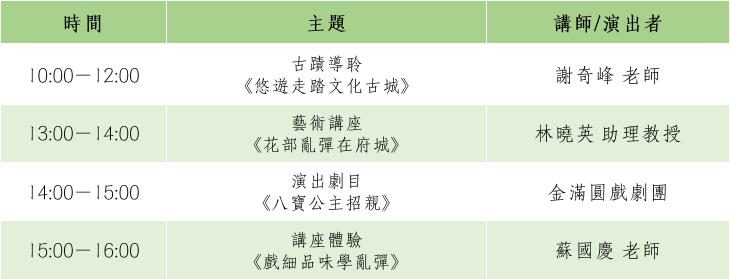 ????活動當日安排「藝術講座」與「古蹟導聆」,由國內文化資產及傳統藝術專家學者及文史工作者共同參與,帶領學員們跟著老師安排的導聆路線與講座體驗,一同走讀古蹟、學習地方特色、體驗在地習俗文化,讓您在周末假期,跟著我們一起看見歷史、賞戲趣!