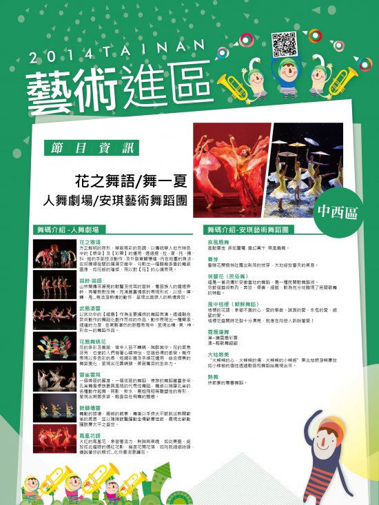 一、演出日期: 103 年 7 月 27 日(日)晚上 7:30 二、演出地點:葉石濤文學廣場(臺南市中正路 1 號,臺灣文學館、重慶寺旁) 三、演出劇目: (一)人舞劇場─花之舞語 (二)安琪藝術舞蹈團─舞一夏 四、檢附活動 EDM 如附件,惠請協助張貼、連結網站活動訊息以廣宣傳。