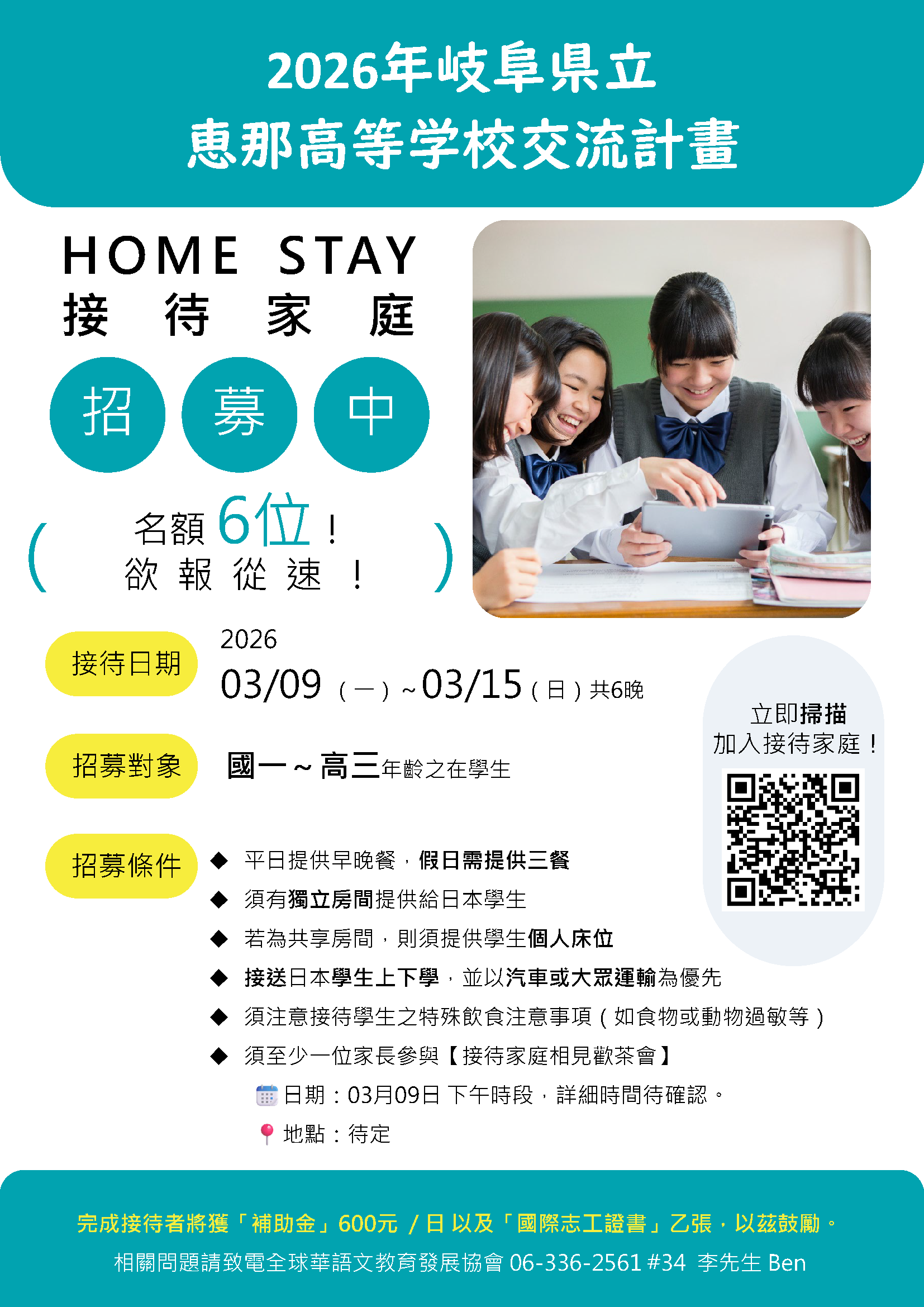 我們誠摯邀請家長與學生參與「日台交流計畫接待家庭」,透過寄宿方式接待日本高中生,讓孩子在日常生活中自然交流、拓展國際視野,創造不同於遊學團的國際經驗。