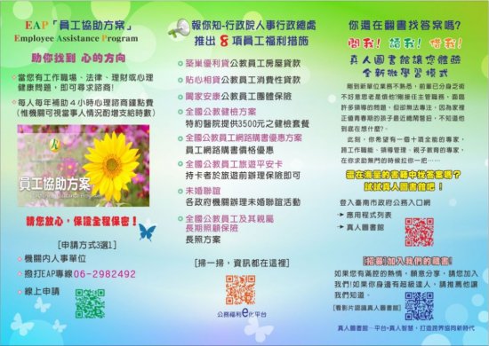 臺南市政府人事處員工協助方案(EAP)專區員工協助及福利關懷網您有工作職場、法律、理財或心理健康問題的煩惱嗎?臺南市政府人事處設有員工協助方案(EAP)專區,即時更新協助方案及諮商資訊,更有多項臺南市員工福利措施報你知,觀迎各位同仁踴躍運用。