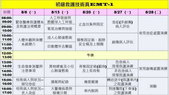 說明: 一、依據教育部國民及學前教育署 107 年 7 月 23 日臺教國署學字第 1070087694 號函辦理。 二、報名時間:即日起至 107 年 8 月 1 日。 三、報名方式:欲參加人員請上國立臺北護理健康大學推廣教育中心 EMT 課程專區線上報名。 四、旨揭課程詳細資訊請詳閱報名簡章,洽詢專線:(02)28227101#3332 薛小姐。