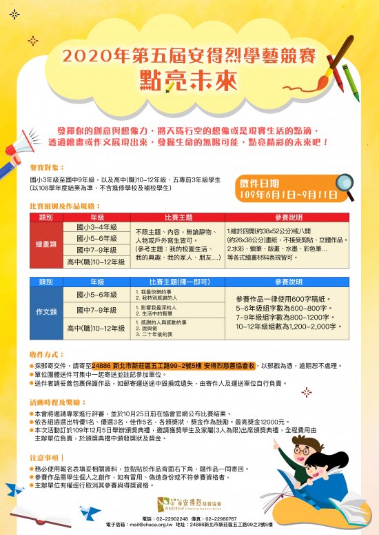 一、為增進台灣偏鄉、(中)低收入戶、清寒弱勢家庭兒少閱讀寫作及美術繪畫的興趣與能力,特別舉辦「作文、繪畫」之學藝競賽活動,以激發學生在文字與繪畫藝術方面的想像力與創作力,鼓勵有志於相關領域創作的學生發揮才華。