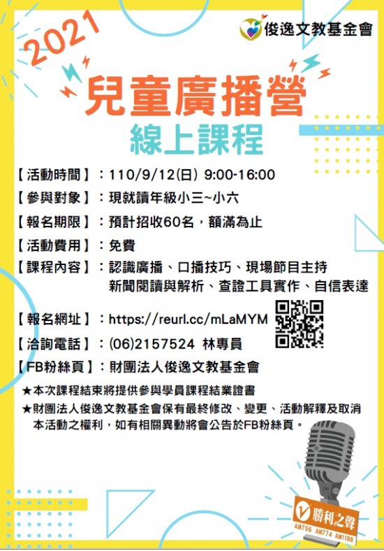 說明: 一、為豐富國小學童多元學習面貌,本會結合勝利之聲廣播公司、電聲廣播電台、俊逸慈善基金會,將於 110 年 9 月 12 日辦理「2021 兒童廣播營」線上免費課程。 二、相關課程內容及線上報名資訊,請至俊逸文教基金會網站→「活動報名」專區(網址: http://www.e-go.org.tw/e-go/event_list.asp 查詢。 三、檢送活動簡章 1 份。