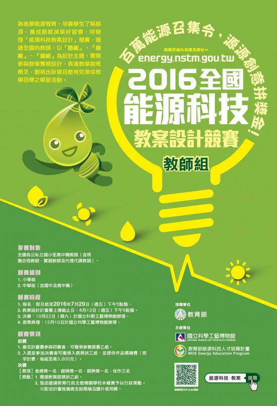 一、本案為教育部指導之全國性競賽,主要目的在於邀請全國中小學教師實際參與能源科技教學實務設計,期能設計具創意性並能有效達成教學目標之課程活動,將能源科技真正落實於日常教學中,確實引導學生展開珍惜能源、愛護環境的行動。