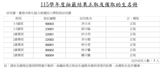 115 學年度大新國小附設幼兒園新生入園第二招錄取公告如附件