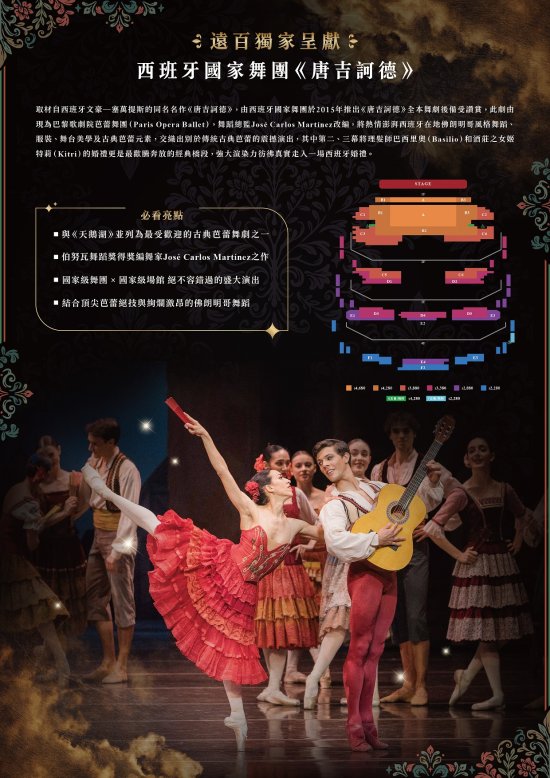 (五)本次演出版本由現任巴黎歌劇院芭蕾舞團舞蹈總監、伯努瓦舞蹈獎( Benois de la Danse )得主 José Carlos Martínez 改編創作。 Martínez 以 19 世紀「古典芭蕾之父」莫里斯.佩蒂帕( Marius Petipa )的經典版本為基礎,在尊重古典技術體系與結構框架的前提下,融入更鮮明的西班牙文化元素,使人物性格更加立體,並透過舞段節奏與場景轉換的流動設計,讓敘事更為緊湊而富層次。