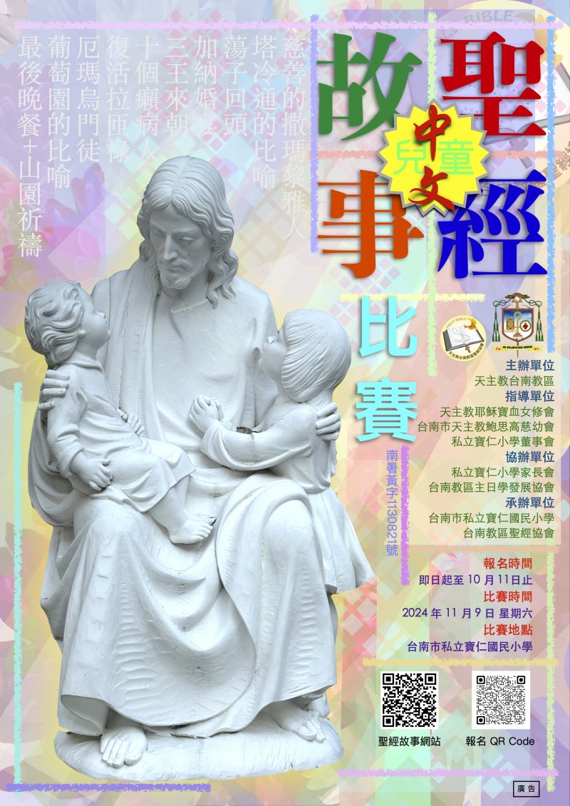1.臺南市北區天主教私立寶仁國民小學辦理天主教台南教區國小學童「兒童中文聖經故事比賽」,敬請鼓勵貴校學生踴躍參加。