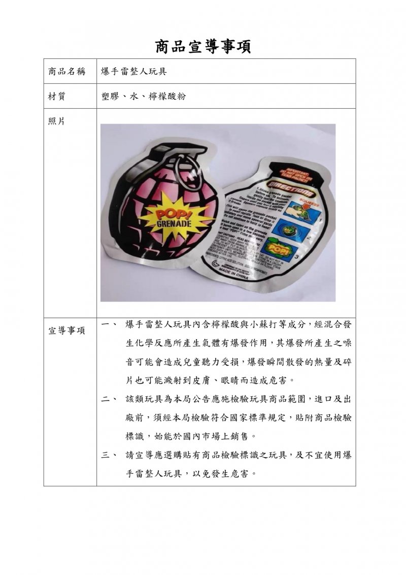 五、檢附宣導爆手雷整人玩具宣導事項資料 1 份(如附件)。