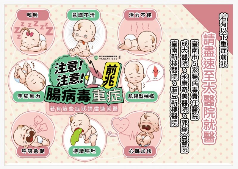 (一)注意腸病毒重症警訊!若您的孩子出現嗜睡、意識不清活力不佳、肌躍型抽搐、手腳無力、呼吸急促、持續嘔吐、心跳加快等重症前兆,請儘速前往大醫院就醫!腸病毒可能引發嚴重併發症,務必提高警覺。臺南市 5 家腸病毒責任醫院:成大醫院、永康奇美醫院、郭綜合醫院、臺南新