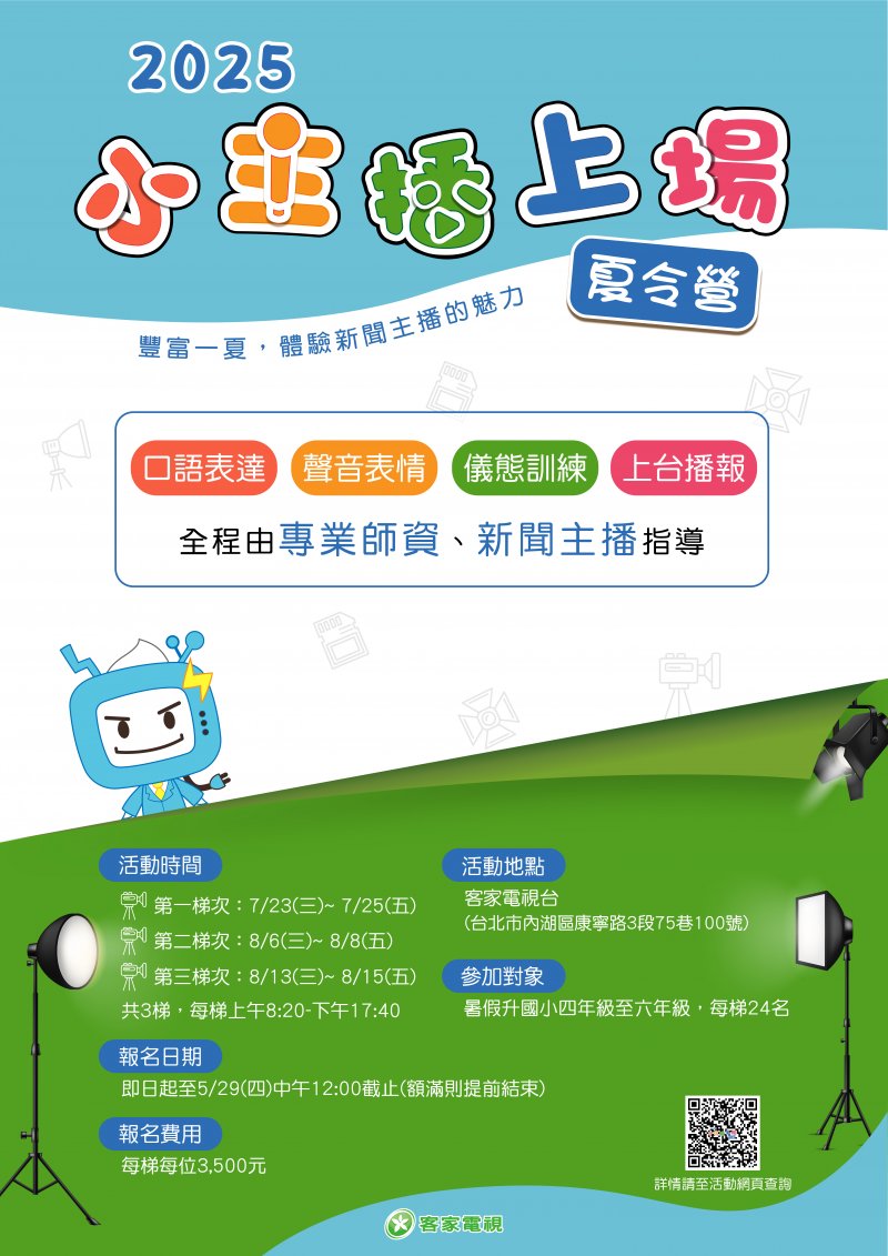 一、為增進學童媒體素養、語言表達能力及團隊合作精神,並透過分組學習與實際演練,體驗新聞製作及主播播報技巧,本會客家電視特於暑期舉辦「2025 客家電視小主播上