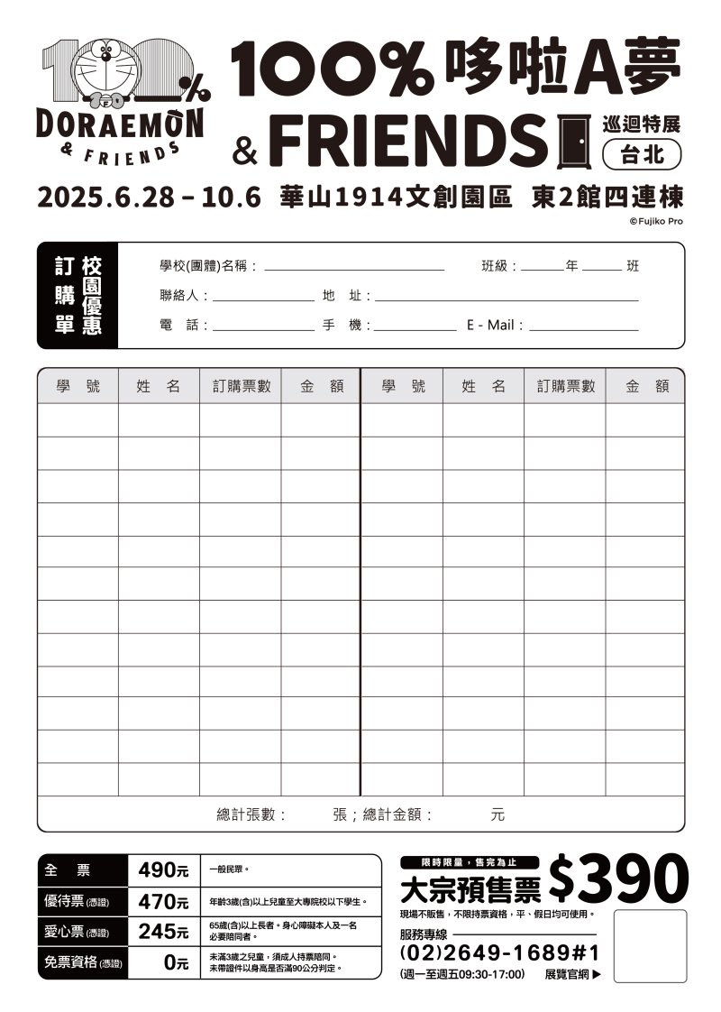 主旨:聯合數位文創股份有限公司訂於 114 年 6 月 28 日~114 年 10 月 6 日於臺北市華山 1914 文化創意產業園區 東 2 館四連棟舉辦「100%哆啦 A 夢&FRIENDS 巡迴特展 台北站」,敬請協助公告周知,鼓勵師生及家長踴躍參與,並規劃進行校外教學及其團體參觀之參考依據,請查照。